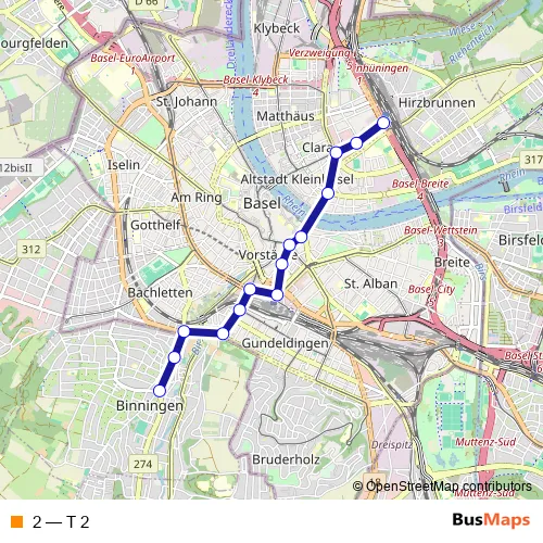 See why over 2 million users trust and consider busmaps.com as the best public transport website. busmaps gives you Basel Trams suggested routes, real-time bus tracker, line route maps in Basel, and helps to find the closest 2 tram stops near you. No internet available? Download an offline PDF map and bus schedule for the 2 tram to take on your trip.