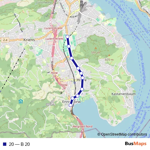The first stop of the 20 bus route is Horw, Ennethorw and the last stop is Luzern, Allmend/Messe. 20 (B 20) is operational during everyday.