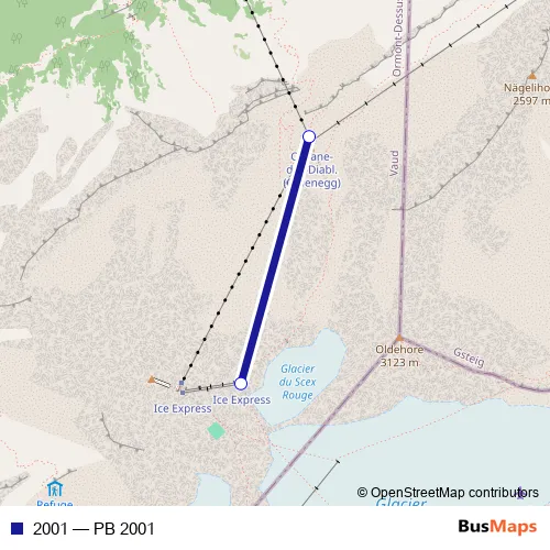 The first stop of the 2001 cable-car route is Cabane-des-Diablerets and the last stop is Glacier du Sex Rouge. 2001 (PB 2001) is operational during everyday.