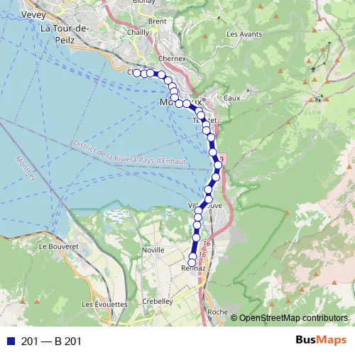 The first stop of the 201 bus route is Clarens, centre and the last stop is Rennaz, village. 201 (B 201) is operational during everyday.