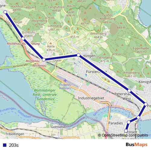 The first stop of the 203s bus route is Hegne, Marianum and the last stop is Konstanz, Bürgerbüro. 203s is operational during on weekdays.