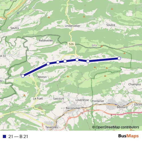The first stop of the 21 bus route is Bellelay, école and the last stop is Les Ecorcheresses. 21 (B 21) is operational during on weekdays.