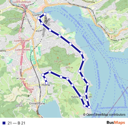 The first stop of the 21 bus route is Horw, Zentrum and the last stop is Luzern, Bahnhof. 21 (B 21) is operational during everyday.