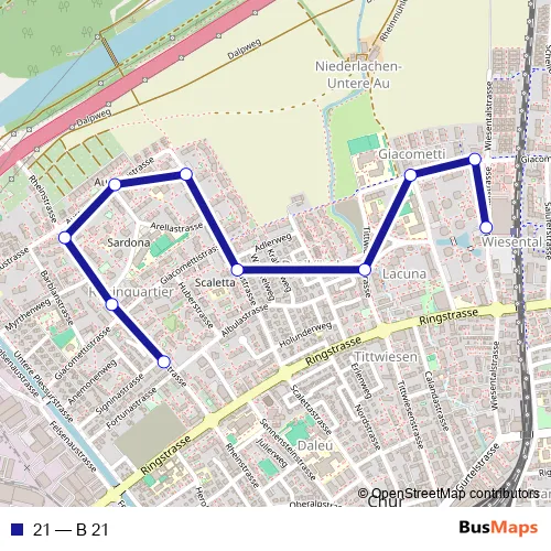 The first stop of the 21 bus route is Chur, Wiesental and the last stop is Chur, Fortunastrasse. 21 (B 21) is operational during everyday.