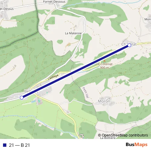 The first stop of the 21 bus route is Bellelay, école and the last stop is Châtelat, village. 21 (B 21) is operational during everyday.