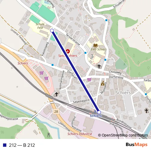 The first stop of the 212 bus route is Schiers, Bahnhof and the last stop is Schiers, Schulhaus Feld. 212 (B 212) is operational during on weekdays.