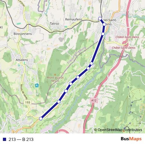 The first stop of the 213 bus route is Châtel-St-Denis, gare and the last stop is Monts-de-Corsier, La Chaux. 213 (B 213) is operational during on weekdays.