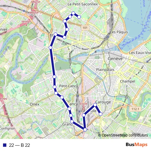 See why over 2 million users trust and consider busmaps.com as the best public transport website. busmaps gives you Geneve Buses suggested routes, real-time bus tracker, line route maps in Geneve, and helps to find the closest 22 bus stops near you. No internet available? Download an offline PDF map and bus schedule for the 22 bus to take on your trip.