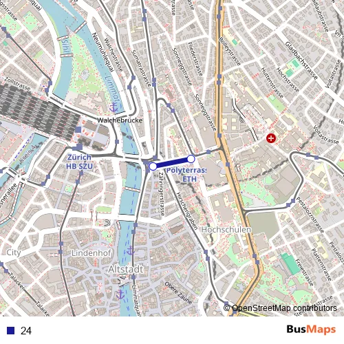 The first stop of the 24 funicular route is Zürich Central (Polybahn) and the last stop is Zürich Polyterrasse. 24 is operational during everyday.