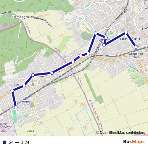 The first stop of the 24 bus route is Grenchen Süd, Bahnhof and the last stop is Lengnau BE, Sportplatz. 24 (B 24) is operational during everyday.