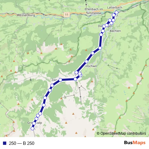 The first stop of the 250 bus route is Schwenden i.D., Grimmialp and the last stop is Oey-Diemtigen, Bahnhof. 250 (B 250) is operational during everyday.