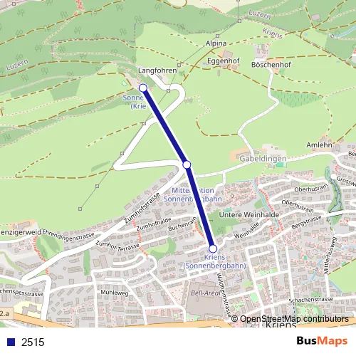 The first stop of the 2515 funicular route is Sonnenberg (Kriens) and the last stop is Kriens (Sonnenbergbahn). 2515 is operational during everyday.