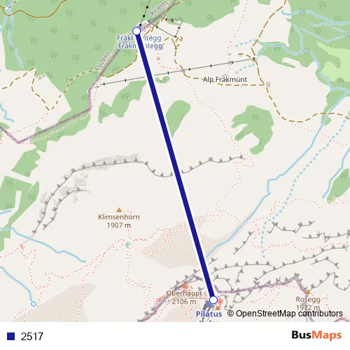 The first stop of the 2517 cable-car route is Fräkmüntegg and the last stop is Pilatus Kulm. 2517 is operational during everyday.