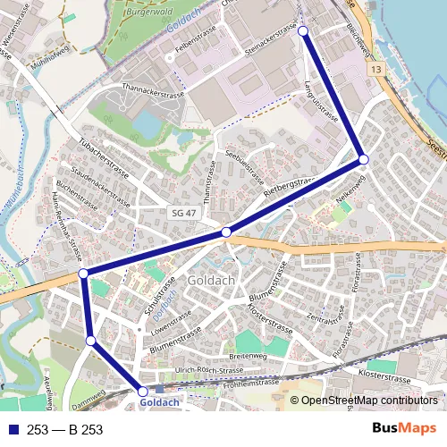 The first stop of the 253 bus route is Goldach, Bahnhof and the last stop is Goldach, Rietli. 253 (B 253) is operational during everyday.