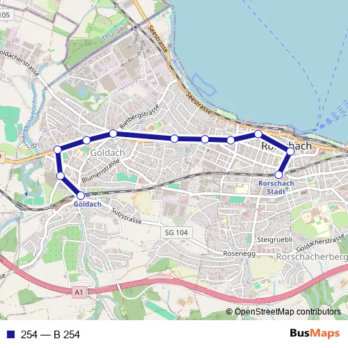 The first stop of the 254 bus route is Rorschach Stadt, Bahnhof and the last stop is Goldach, Bahnhof. 254 (B 254) is operational during on weekends.