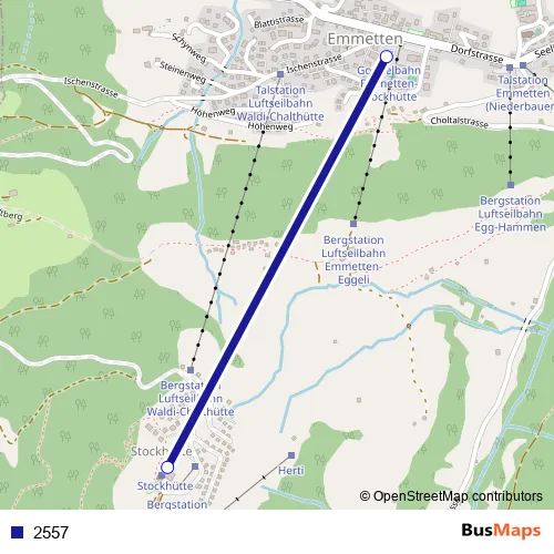 The first stop of the 2557 cable-car route is Stockhütte (Bergstation) and the last stop is Emmetten (Talstation). 2557 is operational during everyday.
