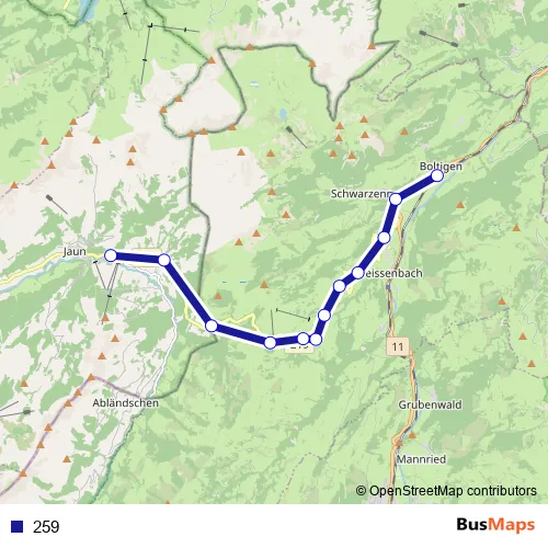 The first stop of the 259 bus route is Jaun, Bergbahnen and the last stop is Boltigen, Bahnhof. 259 is operational during everyday.