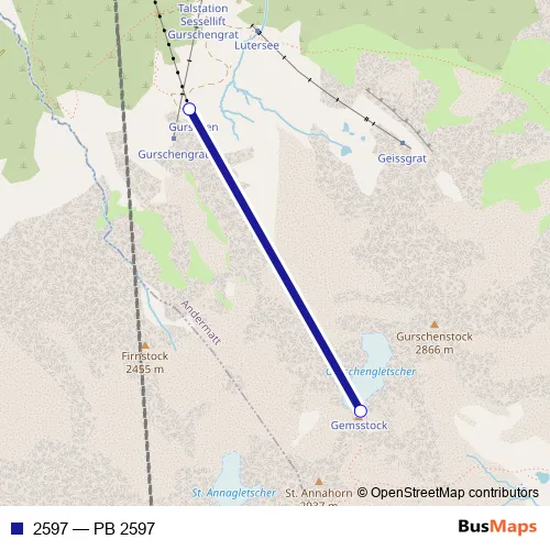 The first stop of the 2597 cable-car route is Gurschen and the last stop is Gemsstock. 2597 (PB 2597) is operational during everyday.