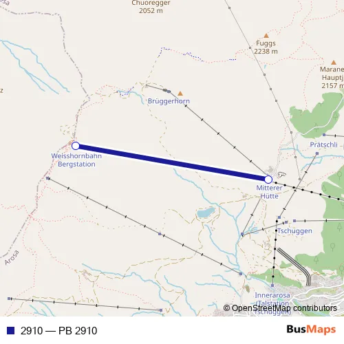 The first stop of the 2910 cable-car route is Weisshorn and the last stop is Arosa (Mittelstation)Weisshorn. 2910 (PB 2910) is operational during everyday.