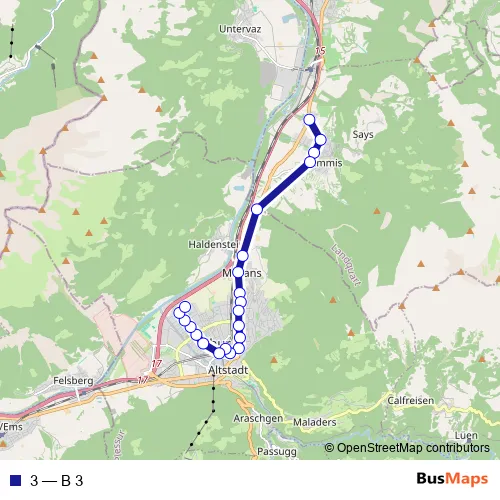 The first stop of the 3 bus route is Trimmis, Alt Strass and the last stop is Chur, Austrasse. 3 (B 3) is operational during on weekdays.