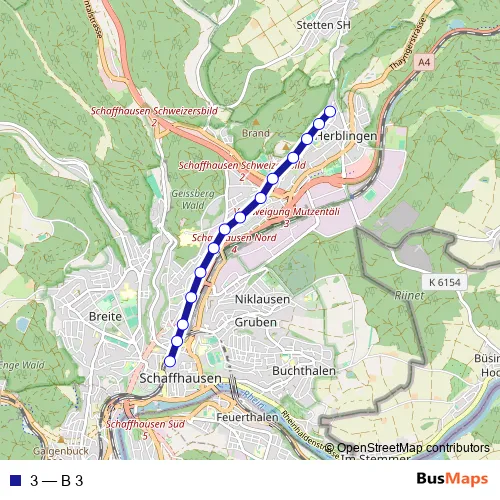 The first stop of the 3 bus route is Schaffhausen, Bahnhof and the last stop is Schaffhausen, Krummacker. 3 (B 3) is operational during everyday.