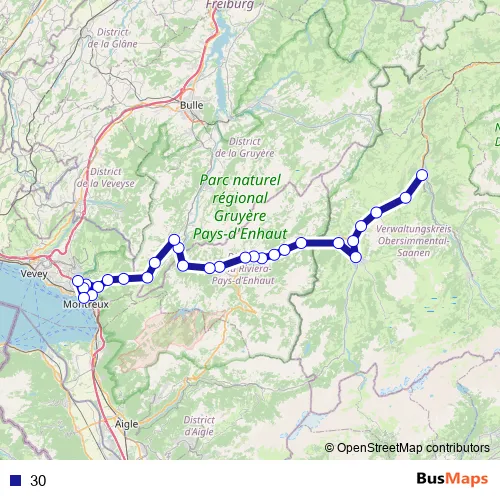 The first stop of the 30 rail route is Zweisimmen and the last stop is Montreux. 30 is operational during everyday.