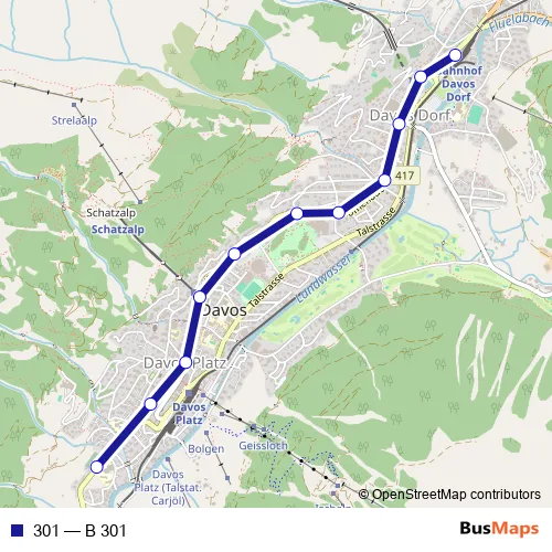 See why over 2 million users trust and consider busmaps.com as the best public transport website. busmaps gives you Davos Buses suggested routes, real-time bus tracker, line route maps in Davos, and helps to find the closest 301 bus stops near you. No internet available? Download an offline PDF map and bus schedule for the 301 bus to take on your trip.