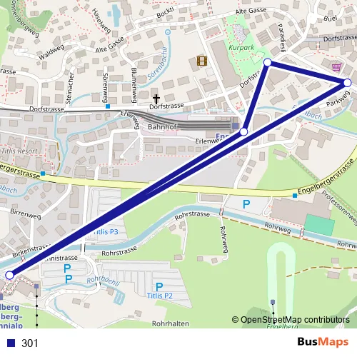 The first stop of the 301 bus route is Engelberg, Titlisbahn and the last stop is Engelberg, Titlisbahn. 301 is operational during everyday.