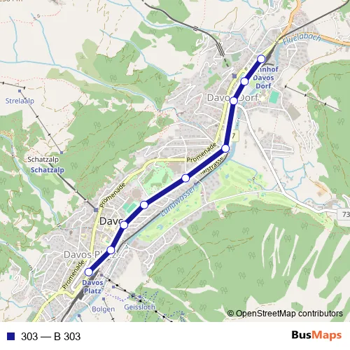 The first stop of the 303 bus route is Davos Platz, Bahnhof and the last stop is Davos Dorf, Bahnhof. 303 (B 303) is operational during everyday.