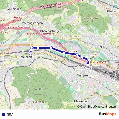 The first stop of the 307 bus route is Zürich Altstetten, Bahnhof N and the last stop is Schlieren, Zentrum/Bahnhof. 307 is operational during everyday.