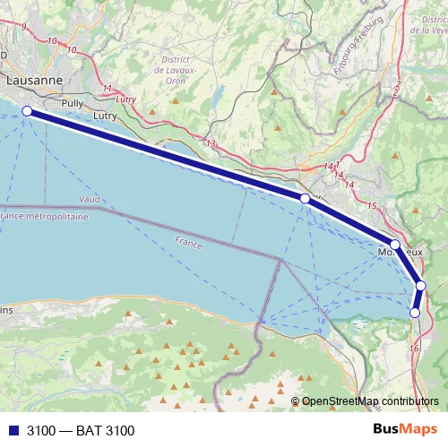 The first stop of the 3100 ferry route is Villeneuve VD (lac) and the last stop is Lausanne-Ouchy (lac). 3100 (BAT 3100) is operational during on weekends.