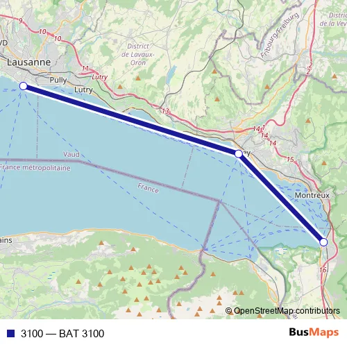 The first stop of the 3100 ferry route is Lausanne-Ouchy (lac) and the last stop is Villeneuve VD (lac). 3100 (BAT 3100) is operational during on weekends.