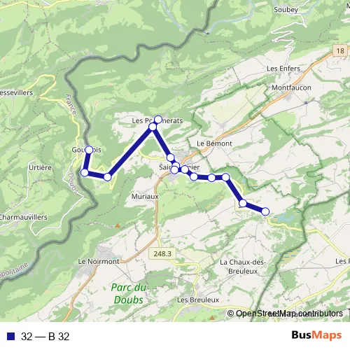 The first stop of the 32 bus route is Goumois, douane and the last stop is Saignelégier, gare. 32 (B 32) is operational during everyday.