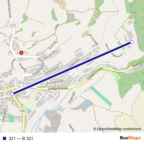 The first stop of the 321 bus route is Riggisberg, Abegg-Stiftung and the last stop is Riggisberg, Post. 321 (B 321) is operational during everyday.