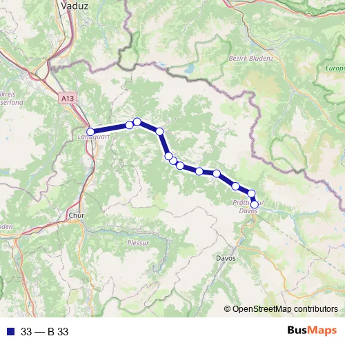 The first stop of the 33 bus route is Klosters Platz, Bahnhof and the last stop is Landquart, Bahnhof. 33 (B 33) is operational during everyday.