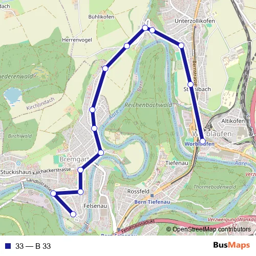 The first stop of the 33 bus route is Worblaufen, Bahnhof and the last stop is Bremgarten BE, Seftau. 33 (B 33) is operational during everyday.