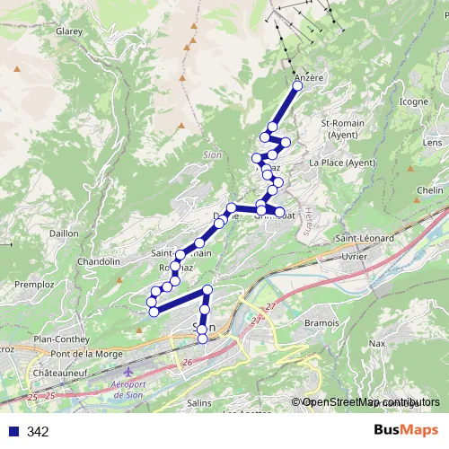 The first stop of the 342 bus route is Anzère, télécabine and the last stop is Sion, poste/gare. 342 is operational during everyday.