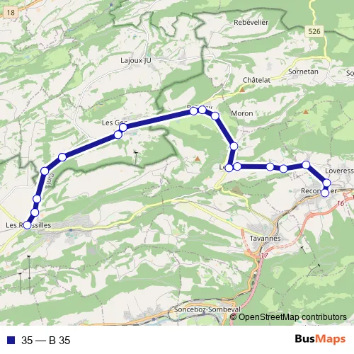 The first stop of the 35 bus route is Reconvilier, gare and the last stop is Les Genevez JU, poste. 35 (B 35) is operational during on weekends.
