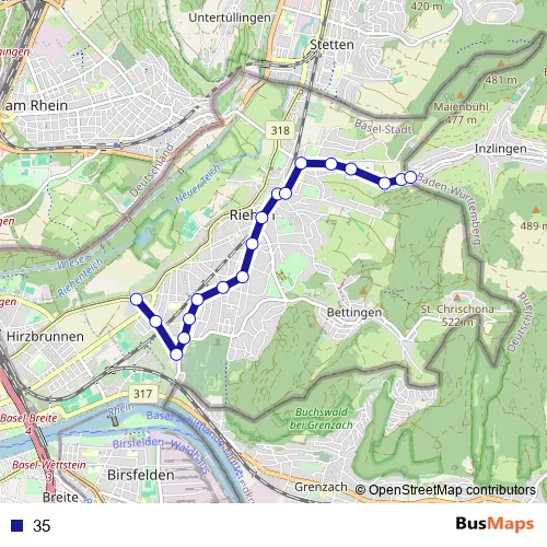 The first stop of the 35 bus route is Riehen, Habermatten and the last stop is Inzlingen Zoll. 35 is operational during everyday.