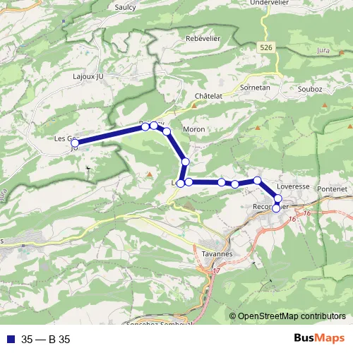 The first stop of the 35 bus route is Les Genevez JU, poste and the last stop is Reconvilier, gare. 35 (B 35) is operational during on weekends.