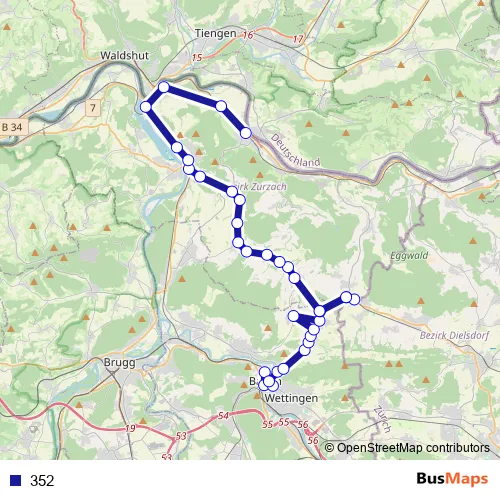 The first stop of the 352 bus route is Baden, Postautostation and the last stop is Endingen, Zentrum. 352 is operational during everyday.