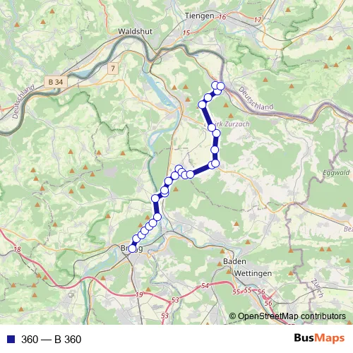 The first stop of the 360 bus route is Brugg AG, Bahnhof/Zentrum and the last stop is Bad Zurzach, Bahnhof. 360 (B 360) is operational during everyday.