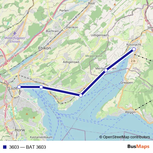 The first stop of the 3603 ferry route is Luzern Bahnhofquai and the last stop is Küssnacht am Rigi (See). 3603 (BAT 3603) is operational during everyday.