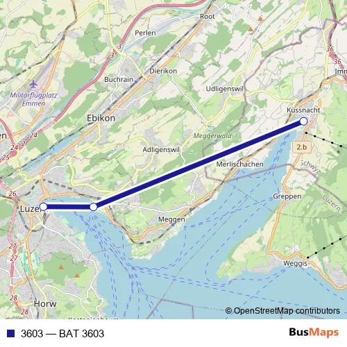 The first stop of the 3603 ferry route is Luzern Bahnhofquai and the last stop is Küssnacht am Rigi (See). 3603 (BAT 3603) is operational during everyday.