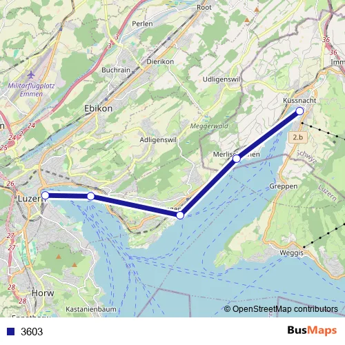 The first stop of the 3603 ferry route is Luzern Bahnhofquai and the last stop is Küssnacht am Rigi (See). 3603 is operational during everyday.