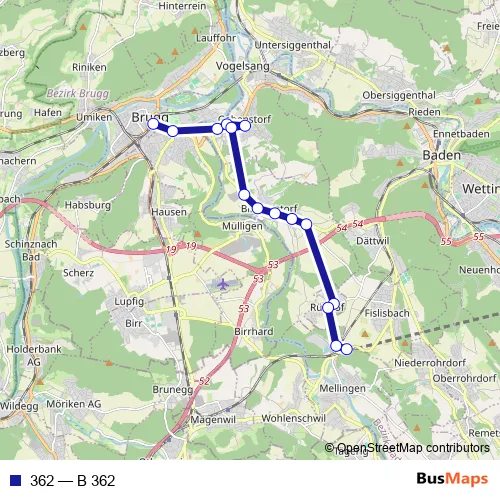 The first stop of the 362 bus route is Brugg AG, Bahnhof/Campus and the last stop is Mellingen Heitersberg, Bahnhof. 362 (B 362) is operational during everyday.