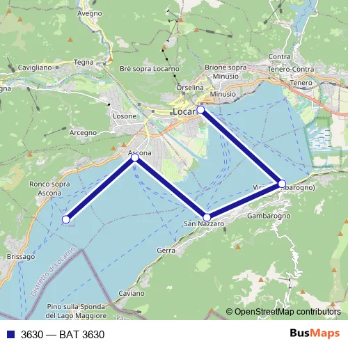 The first stop of the 3630 ferry route is Isole di Brissago and the last stop is Locarno (lago). 3630 (BAT 3630) is operational during everyday.