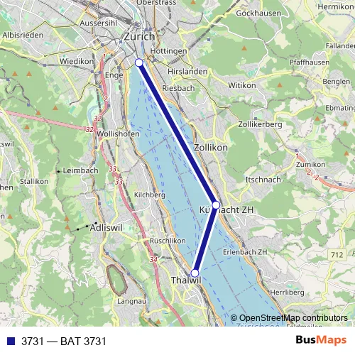 The first stop of the 3731 ferry route is Thalwil (See) and the last stop is Zürich Bürkliplatz (See). 3731 (BAT 3731) is operational during on weekdays.