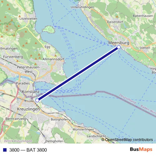 The first stop of the 3800 ferry route is Meersburg (Bodensee) and the last stop is Kreuzlingen Hafen (See). 3800 (BAT 3800) is operational during everyday.