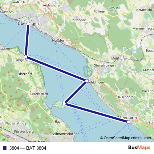 The first stop of the 3804 ferry route is Überlingen Hafen and the last stop is Meersburg (Bodensee). 3804 (BAT 3804) is operational during on weekends.